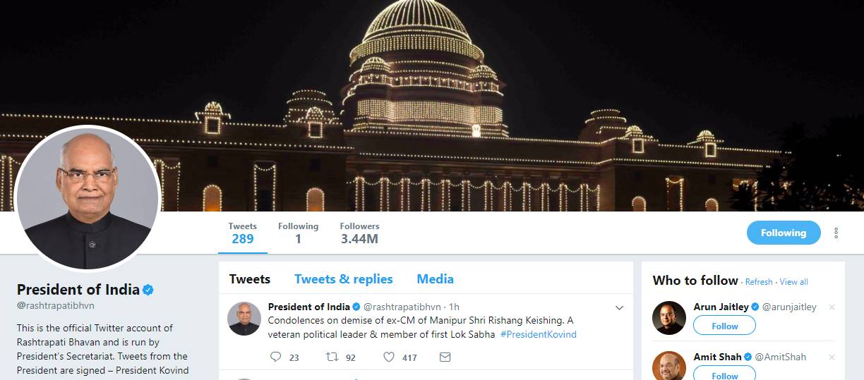 25 जुलाई (2017) को भारत के 14वें राष्ट्रपति के रूप में शपथ लेने वाले रामनाथ कोविंद का ट्विटर अकाउंट ‘प्रेसिडेंट ऑफ इंडिया’ किसे फॉलो करता है, इसे लेकर चौंका देने वाली बात सामने आई है। क्योंकि भारत के राष्ट्रपति का ट्विटर अकाउंट पूरी दुनिया में सिर्फ एक व्यक्ति को फॉलो करता है।