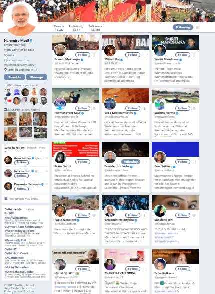 दूसरी तरफ प्रधानमंत्री नरेंद्र मोदी ट्विटर पर वर्तमान में 1,777 लोगों को फॉलो करते हैं जबकि उन्हें फॉलो करने वाले की संख्या 3.3 करोड़ से ज्यादा है। पीएम मोदी जिन्हें फॉलो करते हैं उनमें पूर्व राष्ट्रपति प्रणब मुखर्जी, भारतीय महिला क्रिकेट टीम की कप्तान मिताली राज, क्रिकेटर हरमनप्रीत कौर, क्रिकेटर वेदा कृष्णमूर्ति, प्रेसिडेंट ऑफ इंडिया, क्रिकेटर सुषमा वर्मा, इस्राइल के प्रधानमंत्री बेंजामिन नेतन्याहू, तुर्की का प्रधानमंत्री कार्यलय, तुर्की के राष्ट्रपति, दक्षिण भारत के फिल्म एक्टर नागार्जुन, यूपी के उपमुख्यमंत्री दिनेश शर्मा, यूपी के दूसरे उप मुख्यमंत्री केशव प्रसाद मौर्य, मणिपुर के मुख्यमंत्री बीरेन सिंह, भारत के पूर्व गेंदबाज अनिल कुंबले, कैबिनेट मिनिस्टर रीता बहुगुणा जोशी, पहलवान गीता फोगाट, पहलवान सशील कुमार के साथ सैकड़ों लोगों को फॉलो करते हैं।