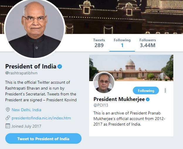 वो हैं भारत के पूर्व राष्ट्रपति प्रणब मुखर्जी। गौरतलब है कि राष्ट्रपति के अकाउंट को 34 लाख से ज्यादा ट्विटर यूजर्स फॉलो करते हैं। वहीं पूर्व राष्ट्रपति प्रणब मुखर्जी को 33.3 हजार लोग ट्विटर पर फॉलो करते हैं। हालांकि मुखर्जी किसी को फॉलो नहीं करते हैं।