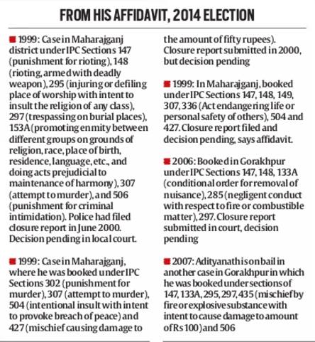 उत्तर प्रदेश के नए मुख्यमंत्री योगी आदित्यनाथ का विवादों से पुराना नाता रहा है। अपनी फायरब्रांड इमेज के लिए मशहूर योगी आदित्यनाथ ने कई एेसे विवादित बयान दिए हैं, जिससे लोगों में उनकी इमेज एक कट्टर हिंदूवादी नेता की बन गई है। लेकिन इन सबसे अलग उनके ऊपर कई आपराधिक धाराओं में मुकदमे दर्ज हैं। अगर बात उनके 2014 लोकसभा चुनावों में दाखिल हलफनामे की करें तो इसमें योगी ने अपने ऊपर लगे सभी मामलों के बारे में जानकारी दी है। आइए आपको बताते हैं इन मामलों और उनमें होने वाली सजा के बारे में: