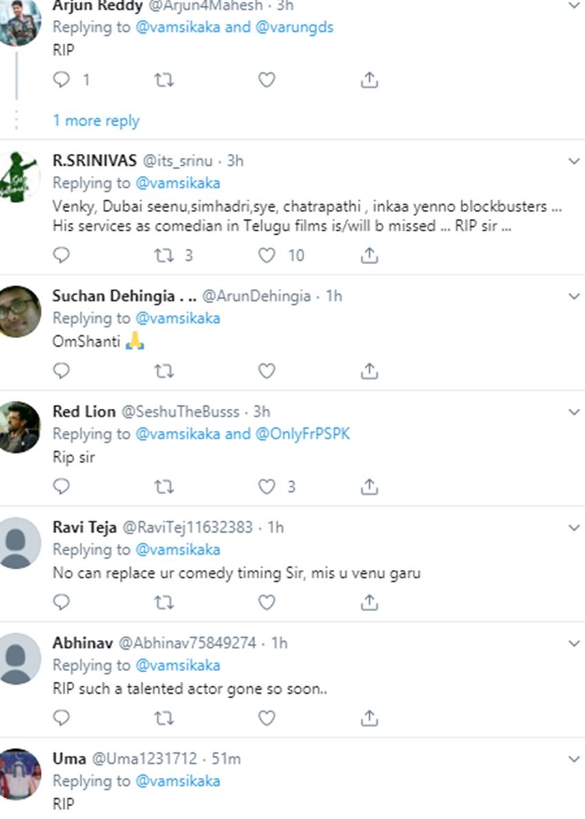 इस ट्वीट को देखने के बाद वेणु के फैंस ने रिएक्शन देने शुरू कर दिए। इस पोस्ट में वेणु को सारे फैंस श्रद्धांजलि अर्पित करते दिखाई दे रहे हैं। फैंस कहते दिखे कि- ‘सर आप हमेशा याद आओगे’, ‘आप जैसा कोई नहीं है। आपको कोई भी रिप्लेस नहीं कर सकता।’, ‘ सर आप हमेशा हमारे दिलों में जिंदा रहेंगे।’