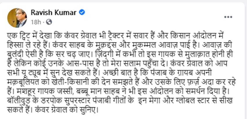 रवीश कुमार ने रविवार को अपनी फेसबुक पोस्ट में लिखा, ‘एक ट्वीट में देखा कि कंवर ग्रेवाल भी ट्रैक्टर में सवार हैं और किसान आंदोलन में हिस्सा ले रहे हैं। कंवर साहब ने मुकद्दस और मुकम्मल आवाज पाई है। आवाज की बुलंदी ऐसी है कि सर चढ़ जाए। जिंदगी में कभी तो इस गायक से मुलाकात होनी ही है लेकिन कोई उनके आस-पास है तो मेरा सलाम पहुंचा दे।’