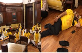प्रदर्शन कर रहे सांसद कह रहे थे, “सभी लोग सुन रहा है, पूरा हिन्दुस्तान सुन रहा है, कांग्रेस को देख…