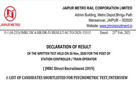 JMRC Recruitment Result 2021, Sarkari Result 2021: उम्मीदवार आधिकारिक वेबसाइट transport.rajasthan.gov.in पर जाकर जयपुर मेट्रो का रिजल्ट चेक और डाउनलोड…