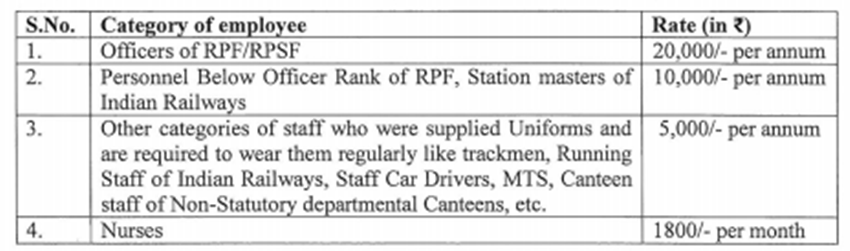 अधिसूचना के अनुसार, मंत्रालय ने सातवें वेतन आयोग के सभी किस्म के भत्तों को मंजूरी दे दी है। इनमें भारतीय रेल के कर्मचारियों को दिए जाने वाले यूनिफॉर्म अलाउंस, वॉशिंग अलाउंस, शूज अलाउंस और किट मेनटेनेंस अलाउंस शामिल हैं। बोर्ड ने इसके अलावा एक सूची भी जारी की है, जिसमें इस बात का जिक्र है कि प्रत्येक अधिकारी और कर्मचारी के लिए यह भत्ते की रकम क्या होगी। नर्सिंग स्टाफ को छोड़ कर सभी कर्मचारियों को ये भत्ते मुहैया कराए जाएंगे।
