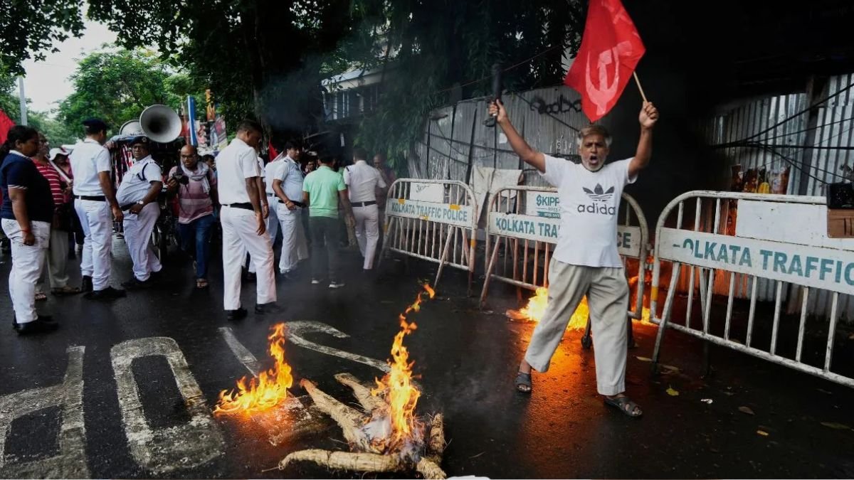 आज, 9 जुलाई को बुलाए गए भारत बंद के तहत श्रमिकों के सड़कों पर उतरने के कारण पश्चिम बंगाल में आगजनी की घटना। सुरक्षा अधिकारियों ने तुरंत आग पर काबू पा लिया।