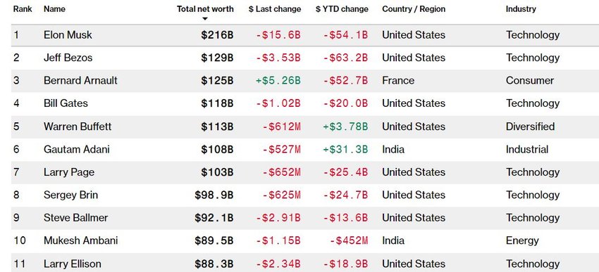 दुनिया के सबसे धनी उद्योगपतियों में शीर्ष पर 216 बिलियन डॉलर के साथ एलन मस्क का नाम है। जबकि 129 बिलियन डॉलर के साथ जेफ बेजॉस दूसरे नंबर पर हैं। सूची में मुकेश अंबानी से ऊपर छठे नंबर गौतम अडानी भी हैं। गौतम अडानी और मुकेश अंबानी के बीच तीन उद्योगपति लैरी पेज, सर्गेई ब्रिन और स्टीव बालमर शामिल हैं।
