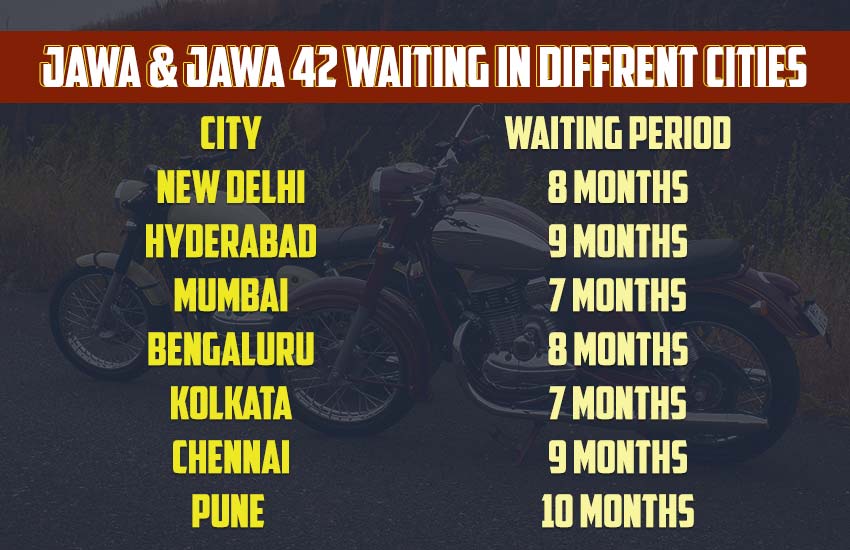यदि वेटिंग पीरियड की बात करें तो सबसे कम वेटिंग पीरियड मुंबई और कोलकाता में है। यहां पर यदि आप अभी बाइक बुक करते हैं तो आपको 7 महीनों में बाइक मिल जाएगी। वहीं पुणे में जावा की बाइक्स का वेटिंग पीरियड सबसे ज्यादा है, यहां पर आपको 10 महीनों के बाद बाइक डिलीवर होगी। नीचे जानिए आपके शहर में इन बाइक्स का वेटिंग पीरियड —