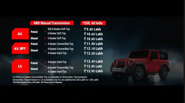 Mahindra Thar Launched: महिंद्रा थार का इंतजार करने वालों का इंतजार अब खत्म हो गया है। Mahindra Thar लॉन्च हो गई है। इसकी शुरूआती एक्स शोरूम कीमत 9.8 लाख रुपए है। यह कीमत पेट्रोल वेरिएंट की है। वहीं इसके टॉप वेरिएंट की एक्स शोरूम कीमत 12.95 लाख रुपए है। महिंद्रा थार को पेट्रोल और डीजल दोनों वेरिएंट में लॉन्च किया गया है। डीजल इंजन के साथ इसकी शुरूआती कीमत 10.85 लाख रुपए है। यह कीमत 6 सीटर की है और सॉफ्ट टॉप के साथ है। वहीं इसके 4 सीटर और हार्ड टॉप वेरिएंट AX OPT की कीमत 12.20 लाख रुपए है। यह कीमत कनर्वर्टेबल टॉप के साथ है। 4 सीटर हार्ड टॉप के साथ इसकी कीमत 12.20 लाख रुपए है। इसके टॉप डीजल वेरिएंट की बात करें तो 4 सीटर कनवर्टेबल टॉप वेरिएंट की कीमत 12.85 लाख रुपए है। वहीं 4 सीटर हार्ड टॉप की कीमत 12.95 लाख रुपए है। यह थार का टॉप वेरिएंट है।