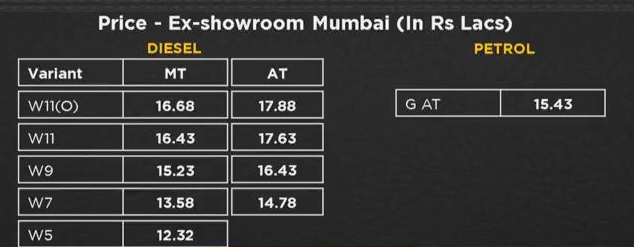 इसमें इलेक्ट्रॉनिक सनरूफ दी गई है। इसके अलावा इलेक्ट्रॉनिकली एडजेस्टेबल ड्राइविंग सीट, रिवर्स पार्किंग कैमरा, पुश बटन स्टार्ट फीचर और कीलैस एंट्री जैसे फीचर दिए गए हैं। इसके सात कलर में लॉन्च किया गया है। इसमें क्रिमसन रेड, मिस्टिक कॉपर, ऑप्यूलेंट पर्पल, वॉल्केनो ब्लैक, लेक साइड ब्राउन, पर्ल व्हाइट और मूनडस्ट सिल्वर कलर मिलेंगे। इसकी शुरुआती कीमत 12.32 लाख रुपए है। जो W5 वेरिएंट की है। इसमें सिर्फ मेनुअल का ही ऑप्शन मिलेगा। वहीं इसके टॉप वेरिएंट W11(O) की कीमत 16.88 लाख रुपए है। इसके पेट्रोल वेरिएंट की कीमत 15.43 लाख रुपए है। यह कीमत मुंबई में एक्स शोरूम हैं।