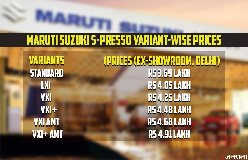 Maruti Suzuki S-Presso Price & Features: देश के ऑटोमोबाइल बाजार में Maruti Suzuki ने एक नए सेग्मेंट की शुरुआत करते हुए अपनी नई मिनी एसयूवी Maruti S-Presso को आखिरकार आज बिक्री के लिए आधिकारिक तौर पर लांच कर दिया है। कंपनी इस कार को 6 अलग अलग ट्रिम में लांच किया है। इसके एंट्री लेवल स्टैंडर्ड वैरिएंट की कीमत 3.69 लाख रुपये तय की गई है वहीं इसके टॉप वैरिएंट जिसमें कंपनी ने AMT ट्रांसमिशन गियरबॉक्स का प्रयोग किया है, उसकी कीमत 4.91 लाख रुपये तय की गई है।