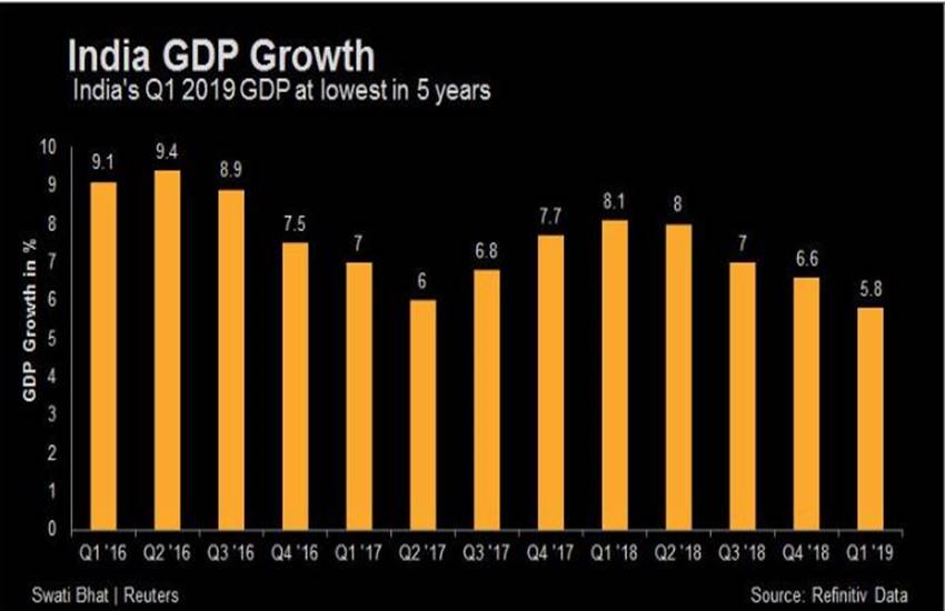 साल 2018-19 के पहली तिमाही में जीडीपी ग्रोथ रेट 8.1 फीसदी थी जो इस साल (2019-20) की पहली तिमाही में गिरकर 5.8 फीसदी रह गई है। इस तरह एक साल में करीब 25 फीसदी की गिरावट जीडीपी ग्रोथ रेट में रही है। समाचार एजेंसी रॉयटर्स के मुताबिक इस साल जनवरी से मार्च तक भारत की जीडीपी ग्रोथ रेट पिछले पांच साल में सबसे कम 5.8 फीसदी रही।