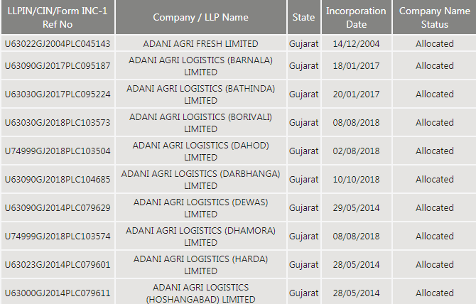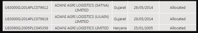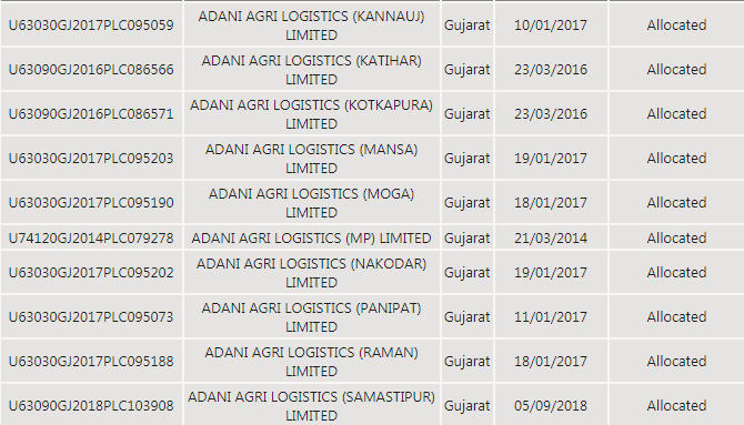 अडानी एग्री लॉजिस्टिक लिमिटेड की कंपनियां- भटिंडा, बरनाला, देवास, होशंगाबाद, कन्नौज, मनसा, मोगा, कटिहार, दरभंगा, समस्तीपुर सतना, उज्जैन जैसे शहरों के लिए रजिस्टर्ड की गई हैं।