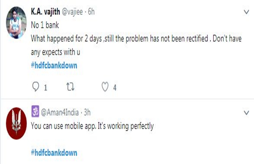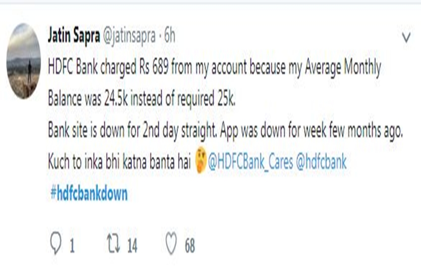 एक यूजर कहते हैं ‘मेरे एचडीएफसी खाते से 689 रुपए काट लिए गए क्योंकि अकाउंट में 25 हजार की बजाय 24,500 रुपए एवरेज मंथली बैंलेस था। अब एचडीएफसी की नेट बैंकिंग बीते दो दिन से ठप है। कुछ तो इनका भी कटना बनता है।’ एक अन्य यूजर ने कहा ‘नंबर वन बैंक की सर्विस पिछले 2 दिनों से बंद पड़ी है। अबतक समस्या के बारे में नहीं पता लग सका है। इनसे किसी तरह की उम्मीद नहीं है।’