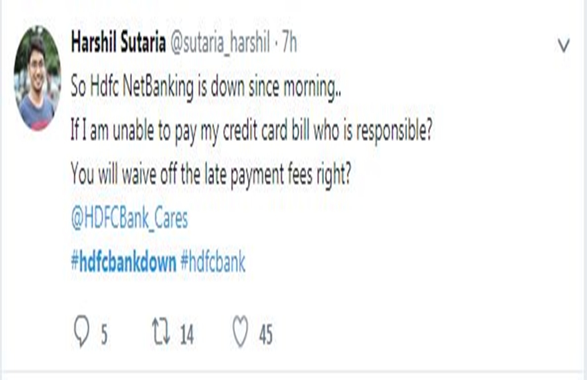 वहीं सोशल मीडिया पर बैंक की इस तकनीकी दिक्कत की जमकर चर्चा हो रही है। ट्विटर पर #hdfcbankdown जोरों से ट्रेंड कर रहा है। लोग इस पर तरह-तरह की प्रतिक्रियाएं दे रहे हैं। एक यूजर ने कहा ‘नेट बैंकिंग सर्विस सुबह सेठप है। मैं अपना क्रेडिट कार्ड के बिल का भुगतान नहीं कर पा रहा हूं। इसका जिम्मेदार कौन होगा? क्या आप लेट पेमेंट फीस को माफ कर देंगे?’