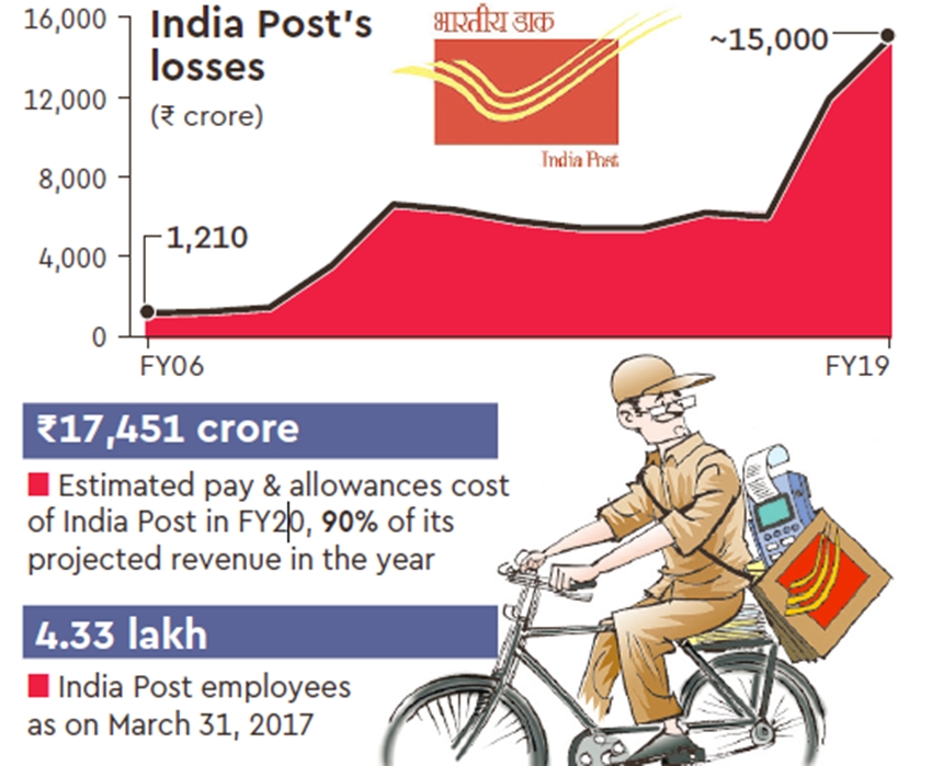 इंडिया पोस्ट का वेतन और भत्ते की लागत वित्त वर्ष 2019 (संशोधित अनुमान) में 16,620 करोड़ रुपये थी, वहीं, कुल राजस्व 18,000 करोड़ रुपये है। यदि पेंशन के रूप में दिए जाने वाले 9,782 करोड़ रुपये को भी जोड़ दिया जाए तो यह पिछले वित्त वर्ष में कुल 26,400 करोड़ हो जाता है। वास्तव में डाक विभाग ने वित्त वर्ष 2020 में 19,203 करोड़ रुपये के अनुमानित राजस्व के मुकाबले, वेतन/भत्ते और पेंशन पर खर्च क्रमश: 17,451 करोड़ रुपये और 10,271 करोड़ रुपये होने का अनुमान लगाया है। इससे स्पष्ट होता है कि स्थिति बिगड़ रही है।