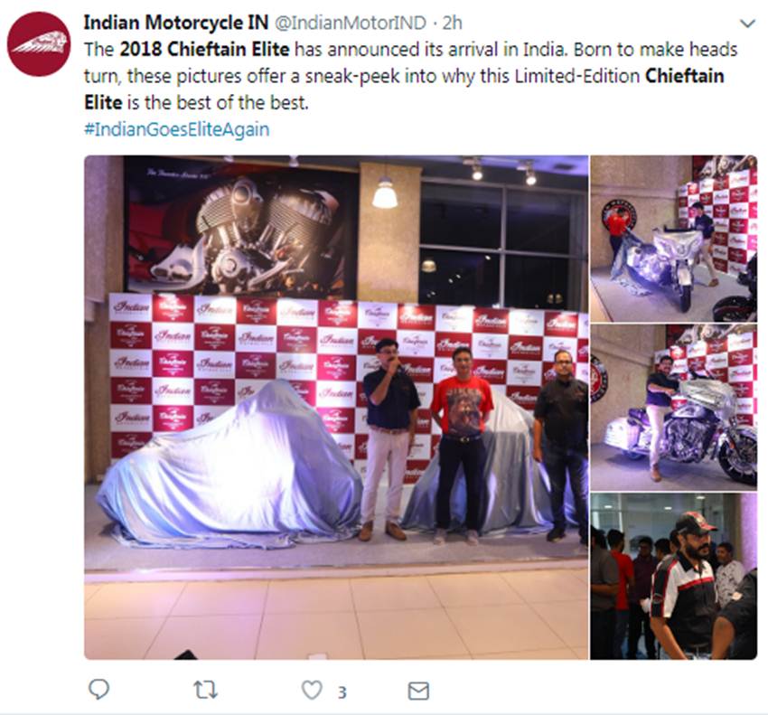 अमेरिकी मोटरसाइकिल कंपनी इंडियन ने भारत में अपनी 2018 इंडियन चीफटेन एलीट (2018 Indian Chieftain Elite)  लॉन्च कर दी है। यह प्रीमियम क्रूजर मोटरबाइक 388 किलो की है, जिसमें 200 वॉट का साउंड सिस्टम दिया गया है। दिल्ली में इसके स्टैंडर्ड मॉडल की एक्स-शो रूम कीमत तकरीबन 38 लाख रुपए है, जबकि एडिश्नल फीचर्स (कलर स्कीम और बाकी चीजें) के साथ यह 40 लाख रुपए तक की पड़ेगी। कंपनी ने इसमें अनोखी पेंट स्कीम के साथ कई खास फीचर्स दिए हैं।
