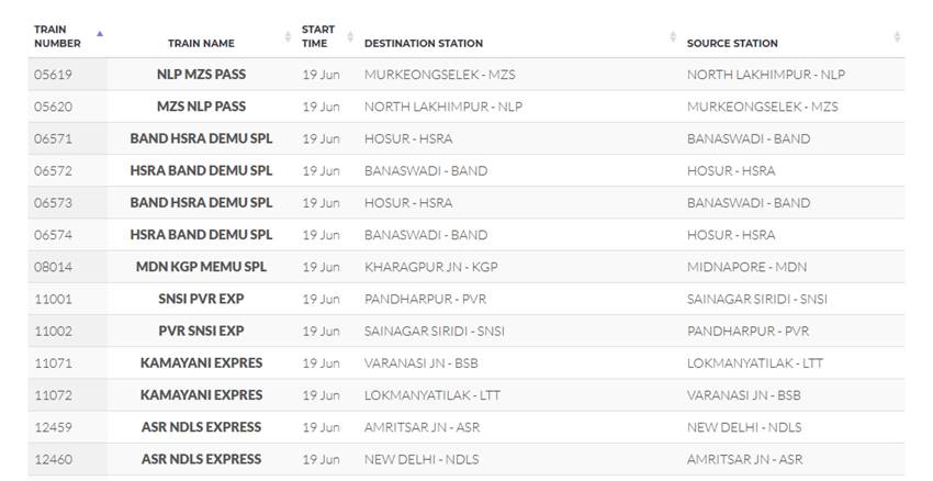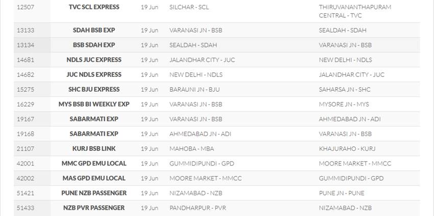 IRCTC Indian Railway Train Status, Running Status, Schedule: आपकी 19 जून की ट्रेन है तो यह खबर आपके बहुत काम की है। आप अपनी ट्रेन के बारे में एक बार यहां चेक जरूर कर लें कि कहीं आपकी ट्रेन भी तो कैंसिल नहीं हो गई है। दरअसर वाराणसी में कुछ रेलवे के काम की वजह से ऐसा हो रहा है कि कुछ ट्रेनों को कैसिंल कर दिया गया है। इसके अलावा भी कई ट्रेनों को अन्य कारणों से भी कैंसिल किया गया है। कैंसिल होने वाली ट्रेनों में लोकल, पैसेंजर और एक्सप्रेस समेत कई तरह की गाड़ियां शामिल हैं। आपको बता दें कि अगर आपकी ट्रेन कैंसिल हो गई है या फिर उसका रूट बदल दिया गया है और आप उससे यात्रा नहीं करना चाहते हैं तो रेलवे के मुताबिक आपको पूरा रिफंड मिलेगा। वहीं अगर ट्रेन 3 घंटे से ज्यादा लेट चल रही है और आप यात्रा नहीं करना चाहते हैं तो आपको टैक्स काटकर रिफंड मिल जाएगा।