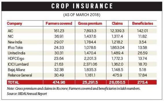 किसानों के फसल बीमा से जुड़ी 11 प्राइवेट इंश्योरेंस कंपनियां मार्च 2018 में खत्म होने वाले साल में 3 हजार करोड़ रुपये से ज्यादा के मुनाफा में हैं। वहीं, सरकारी इंश्योरेंस कंपनियां 4085 करोड़ रुपये के नुकसान में हैं। प्राइवेट इंश्योरेंस कंपनियों द्वारा सरकार से वसूला गया प्रीमियम किसानों द्वारा उनकी फसल के नुकसान के लिए किए गए क्लेम के मुकाबले ज्यादा है। किसानों ने ये क्लेम बाढ़, भूकंप या बारिश की कमी से होने वाले फसल के नुकसान को लेकर किया है। इंश्योरेंस रेगुलेटरी ऐंड डेवलपमेंट अथॉरिटी ऑफ इंडिया (IRDAI) की रिपोर्ट के मुताबिक, प्राइवेट सेक्टर की 11 इंश्योरेंस कंपनियों द्वारा करीब 11,905.89 करोड़ रुपये बतौर प्रीमियम वसूले गए, लेकिन उनसे बतौर क्लेम 8,831.78 करोड़ रुपये का ही दावा किया गया।