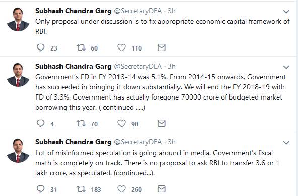 भारतीय रिजर्व बैंक से 3.6 लाख करोड़ रुपये की मांग की योजना पर आर्थिक मामलों के सचिव सुभाष चंद्र गर्ग ने शुक्रवार को कहा कि सरकार का “राजकोषीय गणित पूरी तरह से ट्रैक पर है” और ऐसा कोई प्रस्ताव नहीं है। सुभाष चंद्र गर्ग ने ट्वीट किया कि चर्चा के तहत एकमात्र प्रस्ताव आरबीआई के उचित आर्थिक पूंजी ढांचे को स्थापित करना है। उन्होंने ट्वीट किया कि, “मीडिया में बहुत सी गलत सूचनाएं चल रही हैं। सरकार का राजकोषीय गणित पूरी तरह से ट्रैक पर है। अनुमान लगाया गया है कि आरबीआई को 3.6 या 1 लाख करोड़ रुपये स्थानांतरित करने का कोई प्रस्ताव नहीं है।” आपको बता दें कि काफी समय से आरबीआई और मोदी सरकार के बीच तनातनी की खबरें आ रही हैं। यहां तक की मोदी सरकार ने आरबीआई सेक्शन 7 का इस्तेमाल तक करने की धमकी दे डाली थी। आरबीआई के सेक्शन 7 के तहत आरबीआई केंद्र सरकार के फैसले को मानने के लिए बाध्य होगा। दरअसल खबरें थीं कि मोदी सरकार आरबीआई के रिजर्व को निकालना चाहती थी। इसे लेकर जब विवाद ज्यादा बढ़ा तो सरकार बैकफुट पर आ गई और सफाई दी कि हमने पैसा नहीं मांगा।