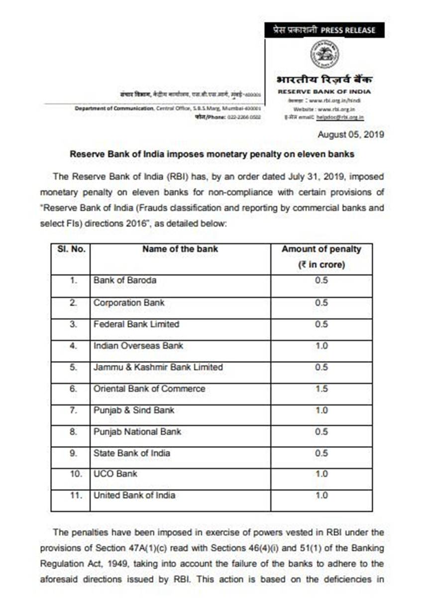 भारतीय रिजर्व बैंक (आरबीआई) ने सोमवार (पांच अगस्त, 2019) को 11 बैंकों के खिलाफ कड़ा ऐक्शन लिया है। अपने कई नियम और प्रावधानों का पालन न करने को लेकर उसने इन सभी बैकों पर पेनाल्टी लगाई है। 31 जुलाई, 2019 के अपने आदेश को जारी करते हुए आरबीआई के आधिकारिक बयान में बताया गया कि जिन बैंकों पर पेनाल्टी लगाई गई है, उनमें बैंक ऑफ बड़ौदा (50 लाख रुपए), कॉरपोरेशन बैंक (50 लाख), फेडरल बैंक लिमिटेड (50 लाख), इंडियन ओवरसीज बैंक (एक करोड़ रुपए), जम्मू एंड कश्मीर बैंक लिमिटेड (50 लाख), ओरियंटल बैंक ऑफ कॉमर्स (डेढ़ करोड़ रुपए), पंजाब एंड सिंध बैंक (एक करोड़ रुपए), पंजाब नेशनल बैंक (50 लाख), स्टेट बैंक ऑफ इंडिया (50 लाख), यूको बैंक (एक करोड़ रुपए) और यूनाइटेड बैंक ऑफ इंडिया (एक करोड़ रुपए) शामिल हैं।