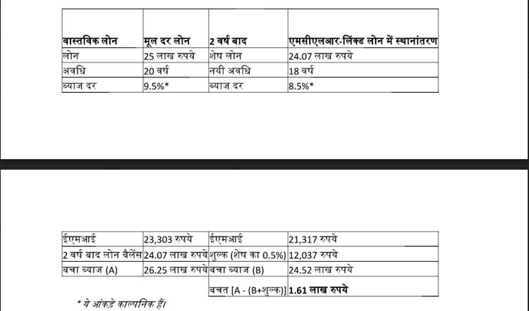 ऊपर दिए गए लोन उदाहरण में दो साल बाद लोन बैलेंस 24.07 लाख रुपये है। 20 साल में इसका वास्तविक ब्याज भुगतान 30.92 लाख रुपए था। मान लीजिए आपने 25वीं ईएमआई के साथ लोन के 10 फीसदी अर्थात् 2.40 लाख रुपये का पूर्व-भुगतान करने का टारगेट बनाया है। यदि आपने 9.5% ब्याज दर पर पूर्व-भुगतान किया तो आपका कुल ब्याज भुगतान, 22.44 लाख रुपये हो जाएगा, जिससे 8.48 लाख रुपये की बचत होगी। लेकिन, यदि आपने एमसीएलआर-लिंक्ड लोन की पहली ईएमआई के साथ उतनी ही रकम का पूर्व-भुगतान किया तो बचे हुए 18 साल के लिए आपका कुल ब्याज 16.83 लाख रुपये हो जाता है, जिससे फिर से 5.61 लाख रुपये की बचत होगी या वास्तविक ब्याज भुगतान योजना की दृष्टि से 14.09 लाख रुपये की बहुत बड़ी बचत होगी।