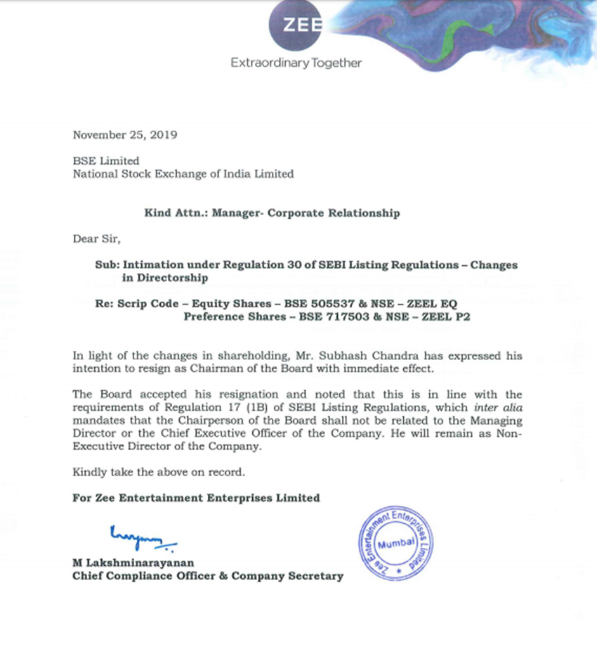 ZEEL के चीफ कंप्लायंस ऑफिसर और कंपनी सेक्रेट्री ने सोमवार को BSE Limited और National Stock Exchange of India को इस बाबत लिखी चिट्ठी लिखी। इसमें कहा गया, “शेयर होल्डिंग में बदलाव के साथ सुभाष चंद्रा ने तत्काल प्रभाव से ZEEL चेयरमैन पद से इस्तीफे की इच्छा जाहिर की है। बोर्ड उनका इस्तीफा स्वीकारता है।”