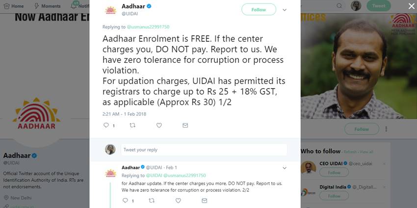 वहीं यूआईडीएआई ने ट्वीट में कहा है कि अगर किसी भी सेंटर पर इससे ज्यादा फीस ली जाती है तो फीस न दें, हमें इसकी सूचना दें। हम भ्रष्टाचार बिलकुल बर्दाश्त नहीं करेंगे। यूआईडीएआई का कहना है कि अगर किसी से ज्यादा पैसे के लिए कहा जाता है तो वह हमें सीधे रिपोर्ट करें। वह हमें पर्सनल मैसेज करें। मैसेज में आधार सेंटर का पूरा पता, एनरोलमेंट ऐजेंट का नाम इसके अलावा अपनी ईमेल आईडी और मोबाइल नंबर दें। हम शिकायत के आधार पर कार्रवाई करेंगे। अगर आप अपने आधार कार्ड का कलर प्रिंट आउट निकलवाते हैं तो उसके लिए 20 रुपए देने होंगे। वहीं ब्लैक एंड व्हाइट प्रिंट आउट के लिए 10 रुपए देने हैं। अगर बच्चों की बायोमेट्रिक डिटेल्स को अपडेट कराना है तो वह फ्री है। हालांकि आधार कार्ड को घर बैठे बैठे ही ऑनलाइन अपडेट किया जा सकता है। ऑनलाइन अपडेट करने के लिए कोई फीस नहीं देनी पड़ती है।