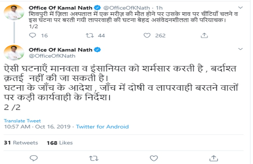 इस पूरे मामले पर मध्य प्रदेश के सीएम कमलनाथ ने ट्वीट कर कहा था कि ‘ऐसी घटनाएं मानवता व इंसानियत को शर्मसार करती हैं…बर्दाश्त क़तई नहीं की जा सकती है। घटना की जांच के आदेश दिए गए हैं…जांच में दोषी व लापरवाही बरतने वालों पर कड़ी कार्यवाही के निर्देश दिए गए हैं।’