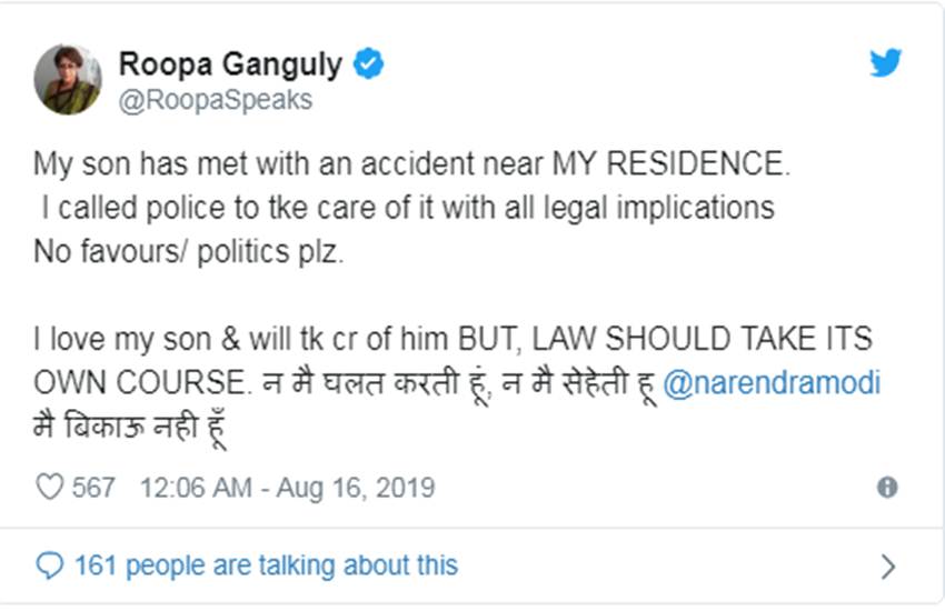 थाने में पुलिस ने आकाश मुखोपाध्याय से लंबी पूछताछ की। इस मामले में भाजपा सांसद रुपा गांगुली ने ट्वीट कर कहा कि कानून ने अपना काम किया है। उन्होंने ट्विटर पर लिखा कि ‘मेरे घर के नजदीर मेरे बेटे की कार हादसे का शिकार हो गई। मैंने पुलिस को फोन कर कहा कि वो इस मामले को देखें..कृप्या कर इस मामले में किसी भी तरह के सियासी दबाव में काम ना करें…मैं अपने बेटे से प्यार करती हूं…लेकिन कानून को अपना काम करना चाहिए।’इस ट्वीट में राज्यसभा सांसद ने प्रधानमंत्री नरेंद्र मोदी को भी टैग करते हुए हिंदी में लिखा कि ‘ना मैं गलत करती हूं…ना मैं सहती हूं…मैं बिकाऊ नहीं हूं।’ (और…CRIME NEWS)