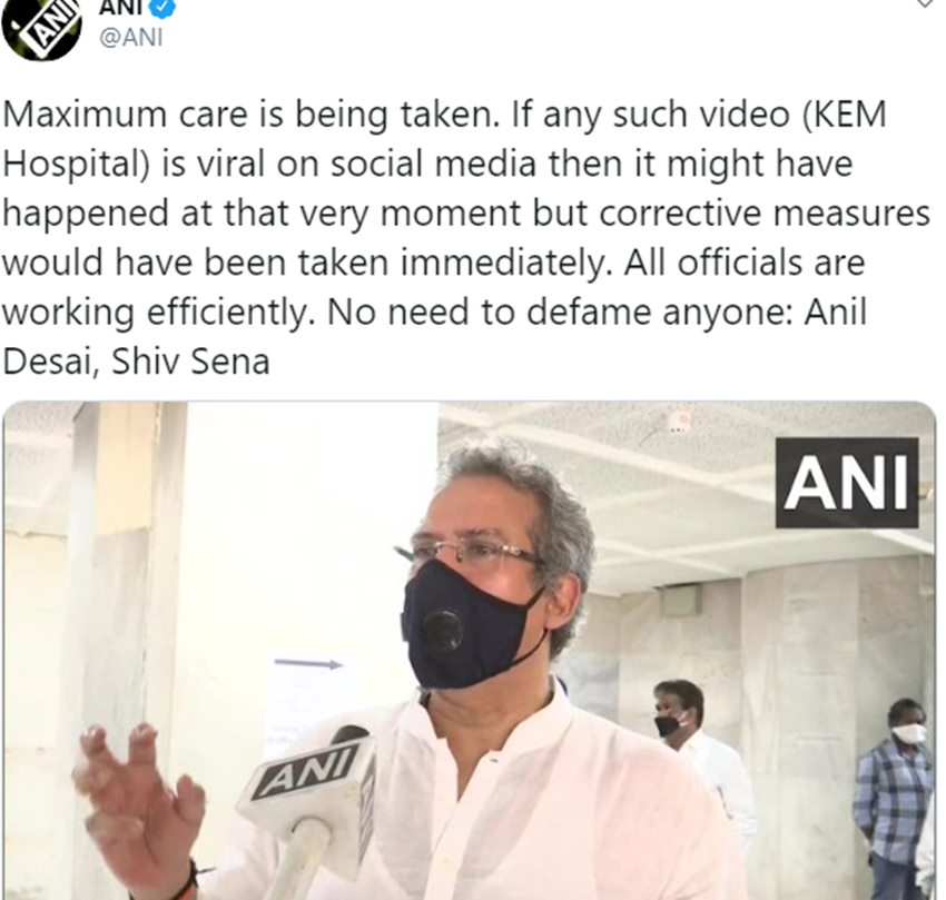 इस बीच महाराष्ट्र में सत्तारुढ़ पार्टी शिवसेना के नेता अनिल देसाई ने इस वीडियो पर अपनी प्रतिक्रिया दी है। अनिल देसाई ने कहा कि ‘किसी को बदनाम करने की जरुरत नहीं है। सभी लोग अपनी पूरी ताकत के साथ काम कर रहे हैं। ज्यादा से ज्यादा ध्यान रखा जा रहा है। अगर इस तरह का कोई भी वीडियो (केईएम अस्पताल) सोशल मीडिया पर वायरल होता है, तो यह उसी क्षण हुआ होगा लेकिन सुधारात्मक उपाय तुरंत किए गए होंगे।’