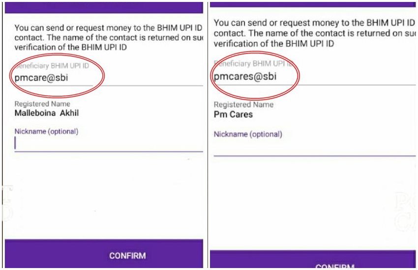 प्रधानमंत्री मोदी ने इस खास राहत कोष का नाम ‘PMCARES@SBI’ रखा था। लेकिन कुछ लोगों ने इस शब्द में से ‘S’ हटाकर ‘PMCARE@SBI’ नाम का एक फर्जी अकाउंट बना लिया है तथा आम लोगों से इस अकाउंट में पैसे जमा करने की अपील भी कर रहे हैं।