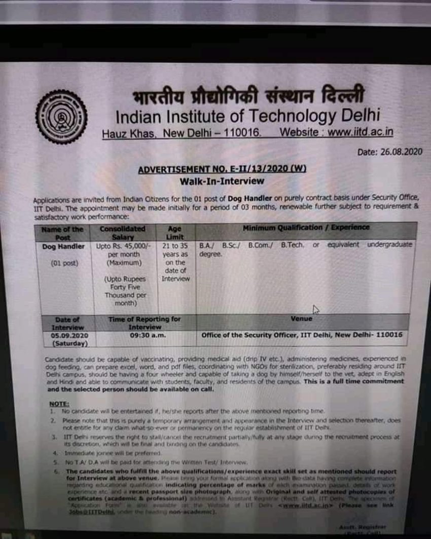 Indian Institute of Technology यानी IIT Delhi में नौकरी को लेकर निकाले गए एक इश्तिहार पर हंगामा खड़ा हो गया है। दरअसल IIT दिल्ली में कुत्ता संभालने के लिए एक पोस्ट पर वैकेंसी आई हुई है। चर्चा इस पोस्ट को लेकर आईआईटी दिल्ली की तरफ से मांगी गई योग्यता और सैलरी को लेकर की जा रही है। दरअसल नौकरी का जो विज्ञापन निकाला गया है उसमें डॉग हैंडलर के लिए B.A/B.Sc/B.Com/B.Tech या इसके समकक्ष अंडरग्रेजुएट डिग्री की योग्यता मांगी गई है।