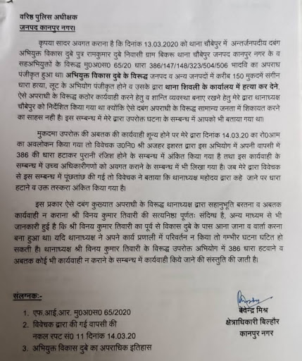अपने खत में सीओ देंवेंद्र मिश्र ने लिखा है ‘उन्होंने शांति व्यवस्था बनाए रखने के लिए थानाध्यक्ष चौबेपुर विनय तिवारी को निर्देशित किया था क्योंकि ऐसे अपराधी के खिलाफ सामान्य जनता शिकायत करने का साहस नहीं रखती। इसके अलावा सीओ ने 13 मार्च 2020 को थाना चौबेपुर में विकास दुबे के खिलाफ आईपीसी की धारा 386/47/48/323/504/506 के तहत दर्ज मामले का जिक्र किया और कहा कि उक्त मामले में उन्होंने एसओ तिवारी को कार्रवाई करने का निर्देश दिया था।’