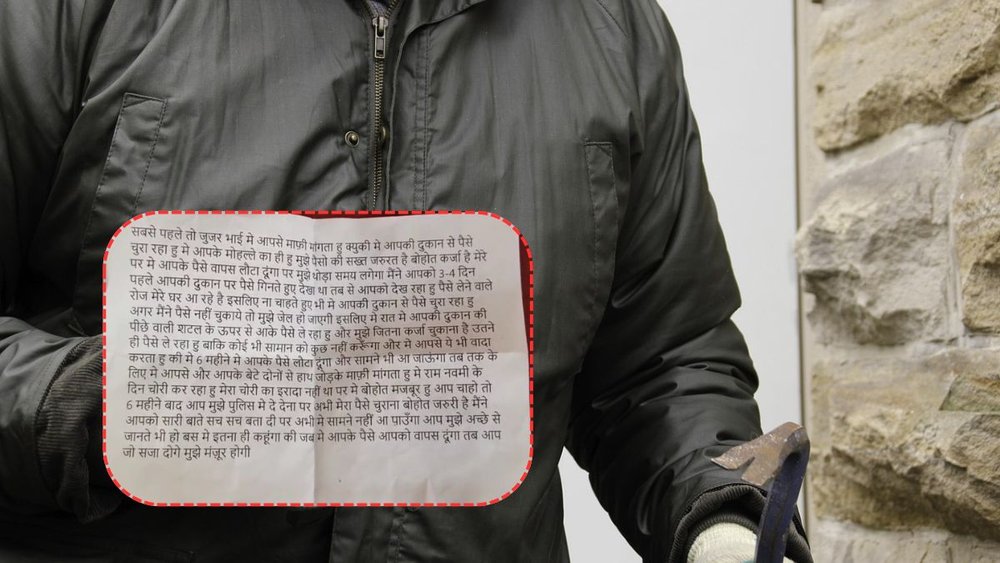 चोरी के बाद चोर द्वारा दुकान में छोड़ी गई चिट्ठी में लिखा है, “सबसे पहले तो जूज़र भाई मैं आपसे माफी मांगता हूं, क्योंकि मैं आपकी दुकान से पैसे चुरा रहा हूं। मैं आपके मोहल्ले का ही हूं। मुझे पैसो की सख्त जरूरत है। बहुत कर्ज है मेरे पर। मैं आपके पैसे लौटा दूंगा, मुझे थोड़ा समय लगेगा। मैंने आपको 3-4 दिन पहले आपकी दुकान पर पैसे गिनते हुए देखा था। तब से आपको देख रहा हूं। पैसे लेने वाले रोज मेरे घर आ रहे हैं।”