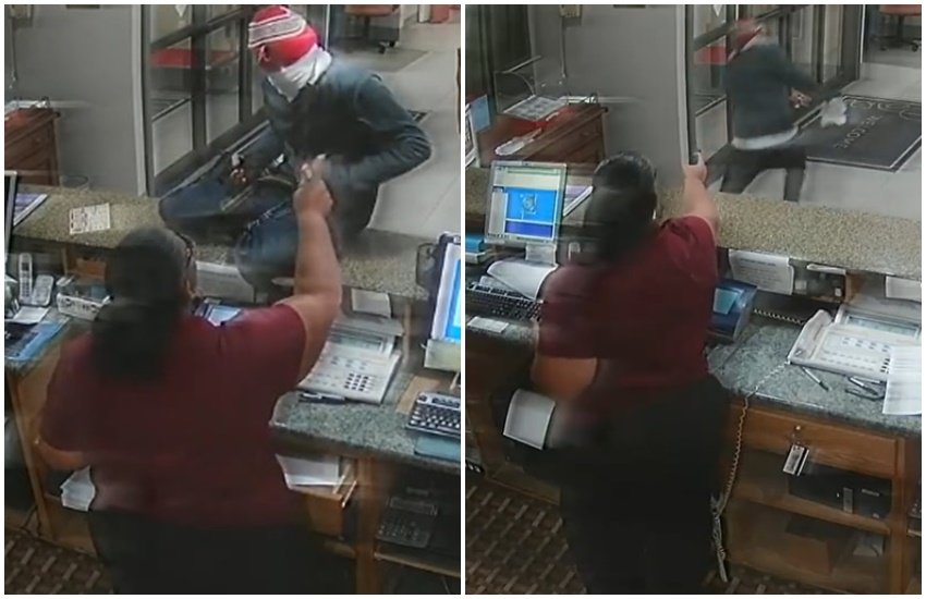 महिला काउंटर में बने आलमीरे से कुछ पैसे निकालकर इस लुटेरे को देती है। यह लुटेरा इन पैसों को थैले में रखने के लिए अपनी बंदूक काउंटर के ऊपर रखता है। लेकिन पलक झपकते ही यह महिला बड़ी फुर्ती से उसका बंदूक छीन लेती है और फिर तुरंत फायर करती है। महिला को हाथों में बंदूक देख यह लुटेरा घबरा कर बाहर की तरफ भागने लगता है।