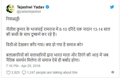 सोशल मीडिया पर वायरल हुए इस वीडियो के बाद बिहार की राजनीति में हंगामा मच गया। राज्य के पूर्व उप मुख्यमंत्री तेजस्वी यादव ने नीतीश सरकार पर निशाना साधते हुए ट्वीट किया, ‘निशब्द हूं! नीतीश कुमार के भाजपाई रामराज में 8-10 दरिंदे एक नादान 13-14 साल की बच्ची के साथ दुष्कर्म कर रहे हैं। विडियो देखकर कांप गया। क्या हो गया है समाज को? बलात्कारियों को सत्ताधारियों द्वारा भारत माता और तिरंगे की आड़ में जब नैतिक समर्थन मिलेगा तो समाज ऐसे ही बर्बाद होगा।’