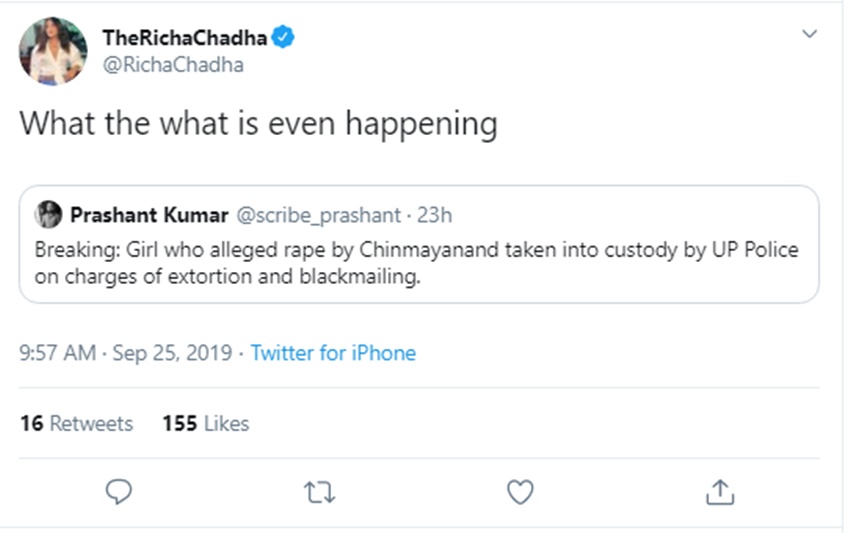 स्वरा भास्कर के अलावा अभिनेत्री ऋचा चड्डा ने भी इस मामले पर अपनी प्रतिक्रिया दी है। एक्ट्रेस ने लिखा कि ‘ये क्या हो रहा है।’ पीड़ित लड़की को पकड़े जाने के बाद ही बॉलीवुड की इन अभिनेत्रियों की प्रतिक्रिया सामने आई है और इन दोनों अभिनेत्रियों ही के ट्वीट पर कई अन्य लोगों ने भी अपनी प्रतिक्रिया दी है।