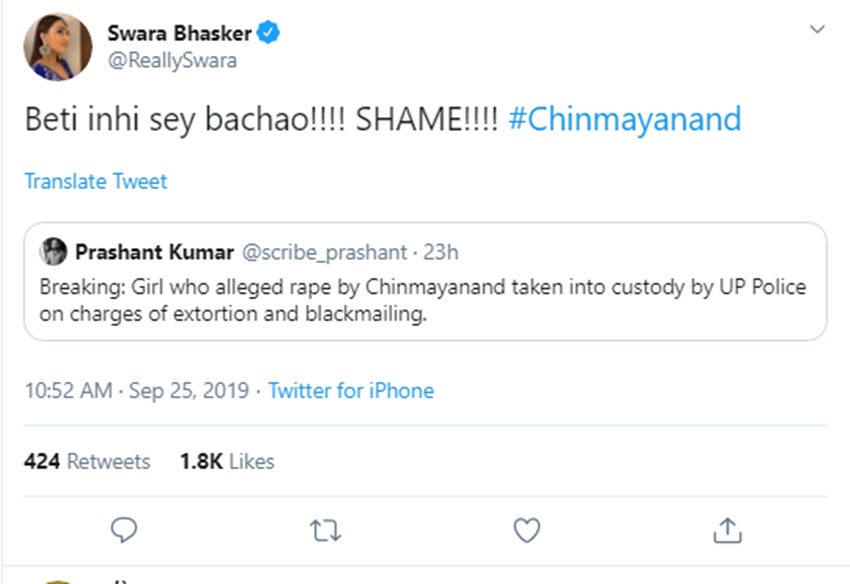 लॉ स्टुडेंट से दुष्कर्म के आरोपी भारतीय जनता पार्टी (BJP) के वरिष्ठ नेता स्वामी चिन्मयानंद को यूपी SIT ने पहले ही गिरफ्तार कर लिया था। इस मामले में चिन्मयानंद की तरफ से भी लड़की पर जबरन वसूली का आरोप लगाया गया था। जिसके बाद जांच टीम ने पीड़ित लड़की को भी गिरफ्तार कर लिया है। पर अब पुलिस की इस कार्रवाई पर बॉलीवुड का गुस्सा फूट पड़ा है। मशहूर एक्ट्रेस स्वरा भास्कर ने ट्वीट कर अपनी भड़ास निकाली है। एक्ट्रेस ने ट्वीट करते हुए कहा कि ‘बेटी इन्हीं से बचाओ!!!!शर्मनाक!!!।’