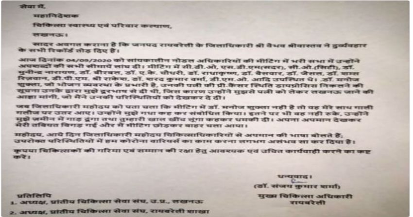 इस बैठक में संबंधित विभाग से जुड़े कई अफसर और अन्य सरकारी कर्मचारी मौजूद थे। इस बैठक के बाद रायबरेली के मुख्य चिकित्सा अधिकारी डॉक्टर संजय कुमार शर्मा की एक चिट्ठी मीडिया में सामने आई थी। इसमें सीएमओ ने आरोप लगाया था कि ‘उन्होंने मुझे गधा कह कर संबोधित किया। इतने पर ही वह नहीं रूके, उन्होंने मुझे जमीन में गाड़ दूंगा तथा तुम्हारी खाल खींच दूंगा कहकर धमकी भी दी।’ यह खत चिकित्सा एवं स्वास्थ्य विभाग के महानिदेशक को लिखी गई थी और इस मामले में उचित कार्रवाई की मांग भी की गई थी।