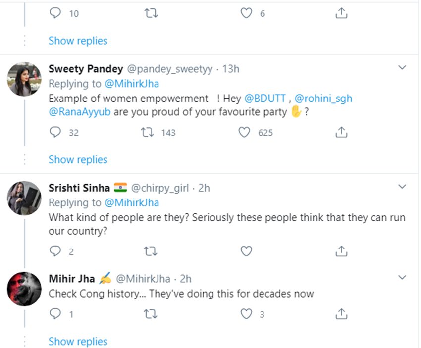 नुपूर शर्मा नाम की एक यूजर ने लिखा कि ‘और यही कोंग्रेसी चले थे महिला सुरक्षा के लिए घास पर लेटने! #देश_जानना_चाहता_है #Hathras’…स्वीटी पांडेय ने लिखा कि ‘यह महिला सशक्तिकरण का उदाहरण है।’ सृष्टि सिन्हा ने अपनी प्रतिक्रिया देते हुए लिखा कि ‘यह किस तरह के लोग हैं? यह लोग सोचते हैं कि यह देश चला लेंगे?’ मिहिर झा ने अपनी प्रतिक्रिया देते हुए लिखा कि ‘कांग्रेस का इतिहास जांच लीजिए…ये लोग ऐसा दशकों से करते आ रहे हैं।’