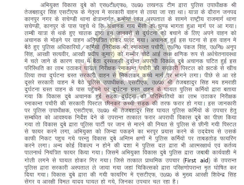 स्पेशल टास्क फोर्स ( STF)के बयान के में कहा गया है कि अभियुक्त विकास दुबे को एसटीएफ उप्र लखनऊ टीम द्वारा पुलिस उपाधीक्षक तेजबहादुर सिंह के नेतृत्व में सरकारी वाहन से लाया जा रहा था। इस दौरान जनपद कानपुर नगर के सचेण्डी थाना क्षेत्र के आने वाले कन्हैया लाल अस्पताल के सामने राष्ट्रीय राजमार्ग थाना सचेण्डी, कानपुर के पास पहुंचे थे कि अचानक गाय भैंसों का झुण्ड भागता हुआ मार्ग पर आ गया। लम्बी यात्रा से थके हुए चालक द्वारा इन जानवरों को बचाने के लिए अपने वाहन को अचानक मोड़ने पर वाहन अनियंत्रित होकर पलट गया। इस दौरान कुछ पुलिसवालों को चोट भी आई।