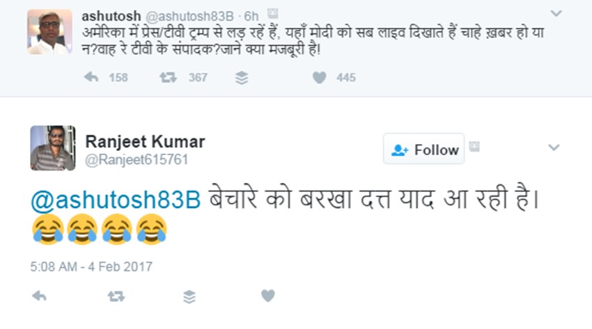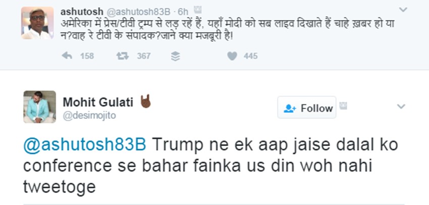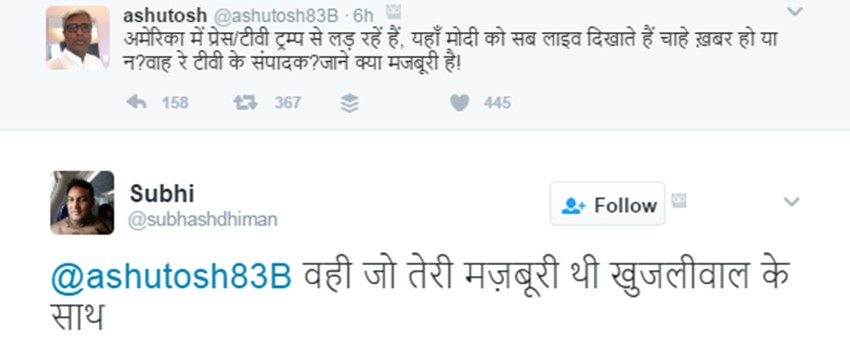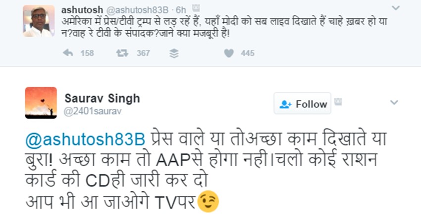 मीडिया पर जब आशुतोष ने निशाना साधा तो कई टि्वटर यूजर्स ने उनकी चुटकी ली। सौरव सिंह नाम के एक यूजर ने कमेंट किया, ‘प्रेस वाले या तो अच्छा काम दिखाते या बुरा! अच्छा काम तो AAP से होगा नहीं। चलो कोई राशन कार्ड की CD ही जारी कर दो, आप भी आ जाओगे TV पर।’ BATOLEBAZI नाम के अकाउंट से लिखा गया है, ‘अब देश के PM को लाइव दिखाने को भी आप से परमिशन लेनी पड़ेगी क्या? आप को अमेरिका में होना चाहिए, तब समझ आता मजबूरी क्या होती है।’ आशिष रमेश नाम के यूजर ने ट्वीट किया, ‘ये इंडिया है, अमेरिका नहीं, भारत में सब ज्ञानी है सिवाए ‘सड़ जी’ के।’