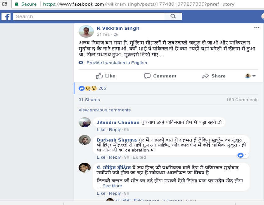 26 जनवरी को गणतंत्र दिवस पर कासगंज में जुलूस के दौरान हुए विवाद में चंदन नामक युवक की हत्या हो गई थी। जिसके बाद कासगंज में दो संप्रदायों के बीच तनाव पैदा हो गया। इस घटना के बाद राघवेंद्र विक्रम सिंह ने यह पोस्ट लिखी थी। उन्होंने बाद में पोस्ट में यह भी जोड़ा, ‘चीन तो बड़ा दुश्मन है, तिरंगा लेकर चीन मुर्दाबाद क्यों नहीं कहते ?’