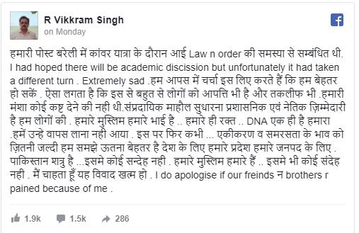 कासगंज में तिरंगा यात्रा जैसे जुलूसों पर सवाल उठाने वाले इस पोस्ट से तूफान मच गया। चूंकि पोस्ट डीएम जैसे अफसर की ओर से किया गया था तो शासन तक आंच जाने लगी। मीडिया रिपोर्ट्स के मुताबिक मुख्यमंत्री स्तर से नाराजगी जताए जाने के बाद डीएम राघवेंद्र विक्रम सिंह ने यह पोस्ट डिलीट कर दी। बाद में डीएम ने दूसरी पोस्ट लिखकर सफाई पेश करते हुए कहा कि उन्होंने बरेली की एक घटना को लेकर पोस्ट लिखी थी, उनका इरादा किसी की भावनाओं को ठेस पहुंचाना नहीं था, बहरहाल वो माफी मांगते हैं। उन्होंने कुछ यू दूसरी पोस्ट लिखी- बाद में डीएम ने माफी मांगते हुए यह पोस्ट लिखी-