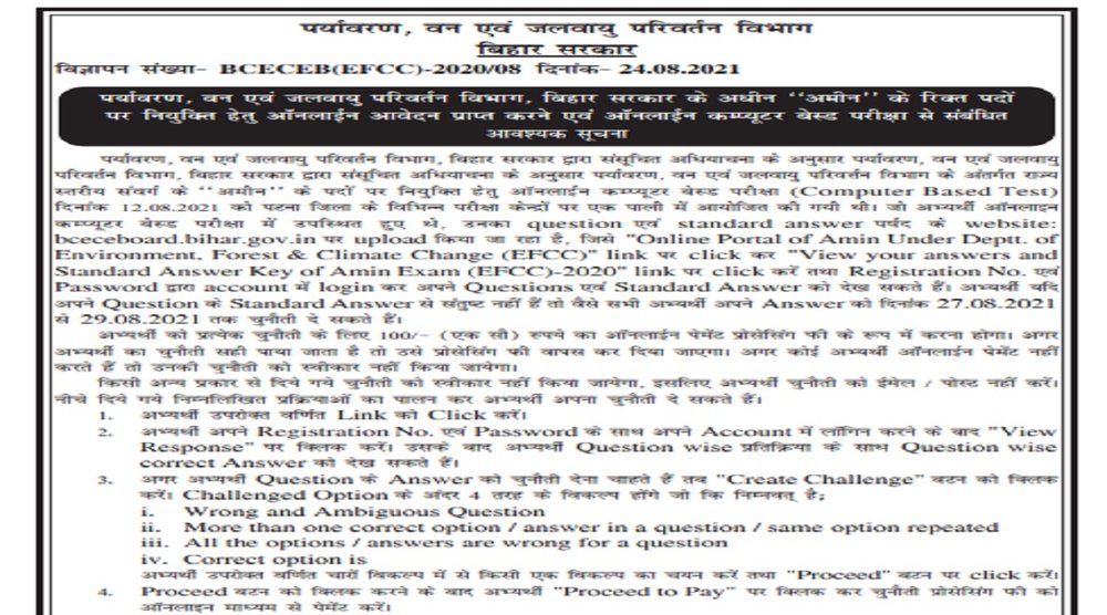 कैंडिडेट्स किसी उत्तर के लिए आपत्ति दर्ज कर सकते हैं। इसके लिए उम्मीदवारों को ऑफिशियल वेबसाइट पर जाना होगा। बिहार आंसर की के लिए आपत्ति दर्ज करने का लिंक 25 अगस्त से 28 अगस्त 2021 तक उपलब्ध रहेगा। कैंडिडेट्स यह ध्यान रखें कि पर्यावरण, वन और जलवायु परिवर्तन विभाग (EFCC) के लिए BCECEB अमीन आंसर की लिंक 27 अगस्त 2021 से 29 अगस्त 2021 तक उपलब्ध रहेगा।