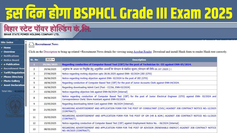 Bihar BSPHCL Technician Grade III Exam Date 2025: बिहार स्टेट पावर होल्डिंग कंपनी लिमिटेड (BSPHCL) ने तकनीशियन ग्रेड-III और विभिन्न अन्य पदों की भर्ती परीक्षा 2025 की तारीखों को आधिकारिक वेबसाइट पर जारी कर दिया है। नोटिफिकेशन के अनुसार, परीक्षा 11-22 जुलाई 2025 में आयोजित की जाएगी। उम्मीदवार ऑफिशियल वेबसाइट bsphcl.co.in पर जाकर अपने नामांकन संख्या, पंजीकरण संख्या या जन्मतिथि का उपयोग करके अपनी परीक्षा तिथि की जांच कर सकते हैं।