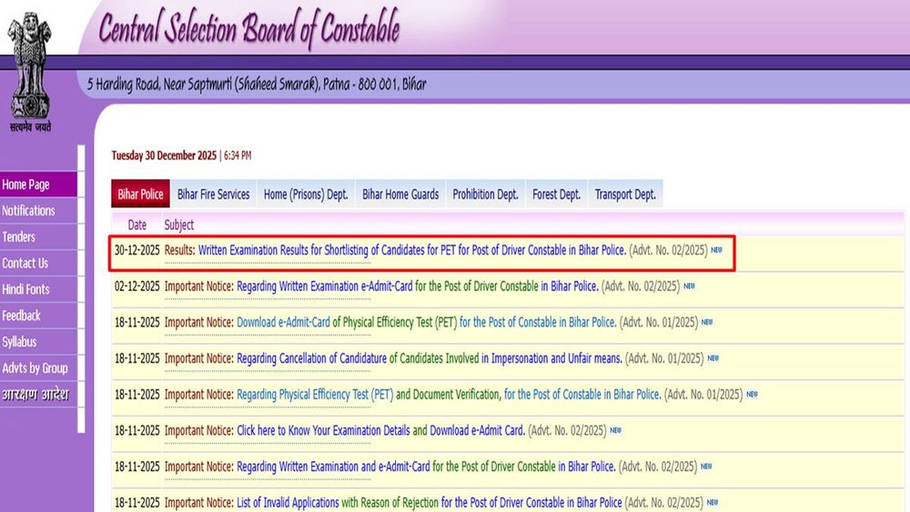 बिहार पुलिस में कांस्टेबल (ड्राइवर) की भर्ती के लिए 10 दिसंबर 2025 को आयोजित हुई लिखित परीक्षा का परिणाम जारी कर दिया गया है। इस एग्जाम में जो कैंडिडेट शामिल हुए थे वह केंद्रीय चयन बोर्ड कांस्टेबल (CSBC) की आधिकारिक वेबसाइट csbc.bihar.gov.in पर जाकर अपना परिणाम चेक कर सकते हैं। इस लिखित परीक्षा में कुल 15516 कैंडिडेट्स शॉर्टलिस्ट हुए हैं जो शारीरिक दक्षता परीक्षा (PET) में शामिल होंगे। लिखित परीक्षा में 1.16 लाख कैंडिडेट उपस्थित हुए थे।