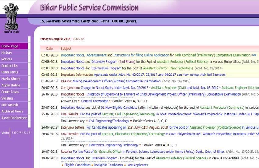BPSC 64th Combined Competitive Exam Recruitment 2018, Notification: Bihar Public Service Commission (BPSC) ने 64th Combined Preliminary Service examination 2018 का नोटिफिकेशन जारी कर दिया है। इच्छुक उम्मीदवार ऑनलाइन आवेदन कर सकते हैं। BPSC ने अपनी ऑफिशियल वेबसाइट https://www.bpsc.bih.nic.in/ पर नोटिफिकेशन जारी किया है। 64th Combined Preliminary Service examination 2018 के लिए रजिस्ट्रेशन शुक्रवार (3 अगस्त) से शुरू होगा और 20 अगस्त तक चलेगा। परीक्षा शुल्क भरने की अंतिम तिथि 24 अगस्त है। परीक्षा शुल्क जमा कराने के बाद आप आवेदन कर सकते हैं जिसकी अंतिम तिथि 31 अगस्त है। रजिस्ट्रेशन कराने के अगले दिन 11 बजे के बाद उम्मीदवार के लिए ऑनलाइन भुगतान करने के लिए आवेदन लिंक उपलब्ध होगा। शुल्क का भुगतान होने के अगले दिन 11 बजे के बाद आवेदक को आवेदन करने के लिए एप्लिकेशन फॉर्म का लिंक मिल जाएगा। भुगतान करने की अंतिम तिथि 24 अगस्त है। इस तारीख तक भुगतान जरूर कर लें।