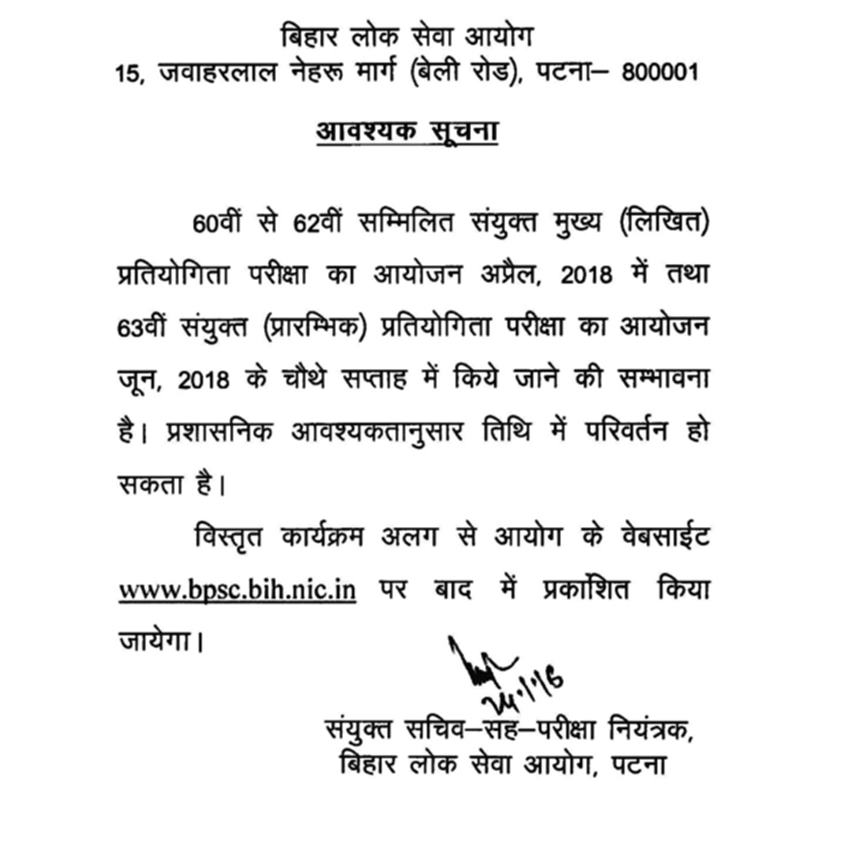 उम्मीदवारों के लिए बेतहर होगा कि वे नियमित रूप से वेबसाइट चेक करते रहें। परीक्षा शेड्यूल में कोई भी बदलाव या उससे संबंधित कोई भी जानकारी सबसे पहले वेबसाइट पर अपलोड की जाएगी। गौरतलब है बिहार लोक सेवा आयोग ने 60वीं, 61वीं, 62वीं कॉमन कम्बाइंड कम्पिटिटिव परीक्षा के लिए नोटिफिकेशन गत वर्ष नवंबर महीने में जारी किया था। इस परीक्षा के जरिए 642 पदों पर नियुक्ति की जाएगी। परीक्षा दो चरणों में होती है। प्रारंभिक और मेंस। 60वीं से 62वीं कॉमन कम्बाइंड की अब मेन्स परीक्षा का आयोजन शेष है। वहीं 63वीं कम्बाइंड की प्रीलिमिनरी परीक्षा होनी है।